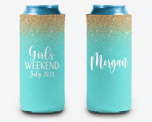 Beach Bach Watercolor Can Cooler Aqua Coral Bachelorette Trip Personalized Can Cooler Sleeve -